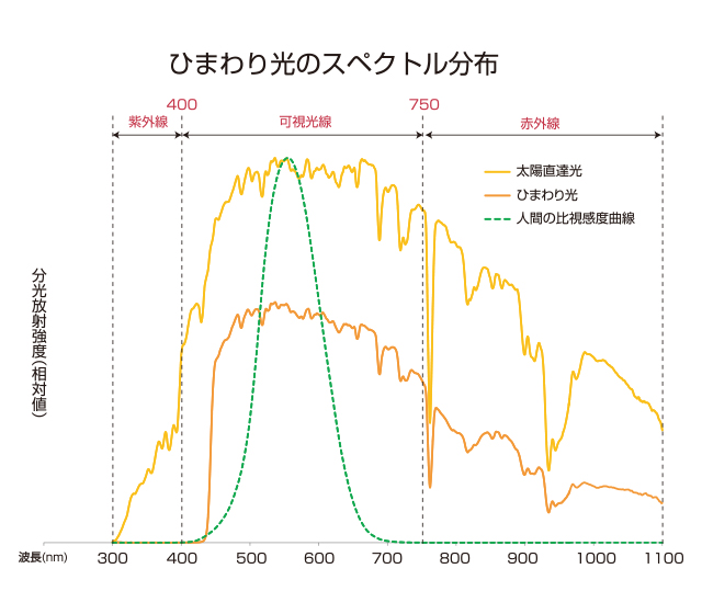太陽光照明ひまわりがお届けする光は太陽光の波長成分のうちの「可視光成分」を中心に集めた 「安心で安全な光」です。