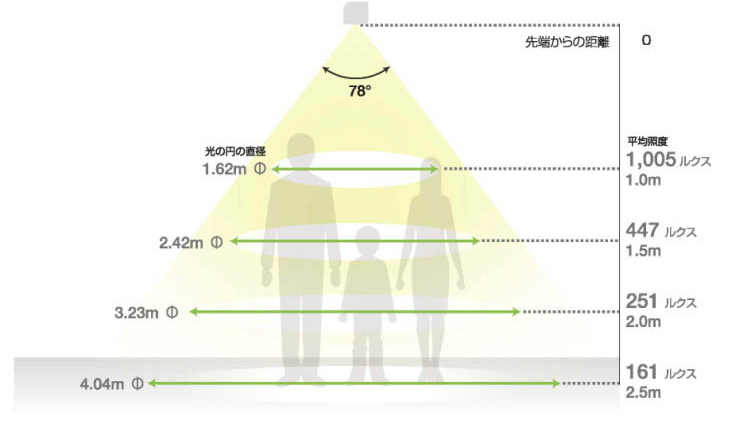 | 中心照度 [ルクス] | 5,628 | 1,407 | 625 | 352 | 225 | 156 |
