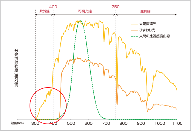 分光分布図でわかるように「ひまわり」から発せられる光は、ほぼ太陽と同じカーブを描いていますが、紫外線域だけはカットされることがわかります。(赤マルの部分)